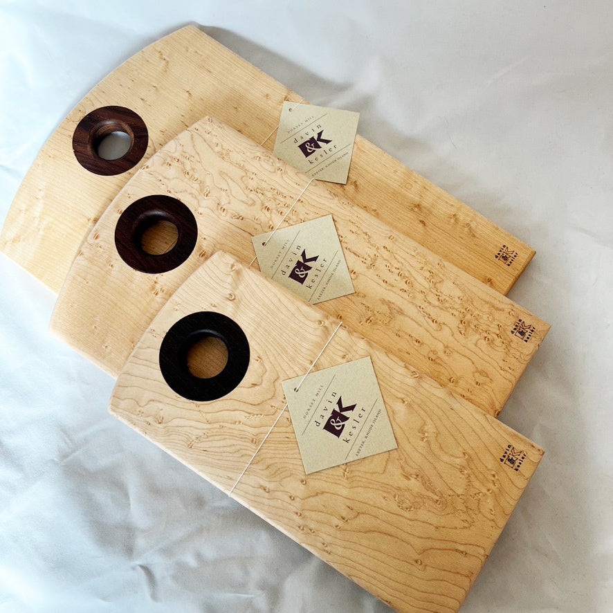 Breadboard/Cutting Board is handcrafted by Davin & Kesler using tiger curly maple and cocobolo wood. This set of three boards is certain to enhance your kitchen and will hold up well for many years of enjoyment. Finished with food grade beeswax. Hand wash. Large Board Measures 15"x10", Medium 13"x8.5" and Small 11"x5.5".