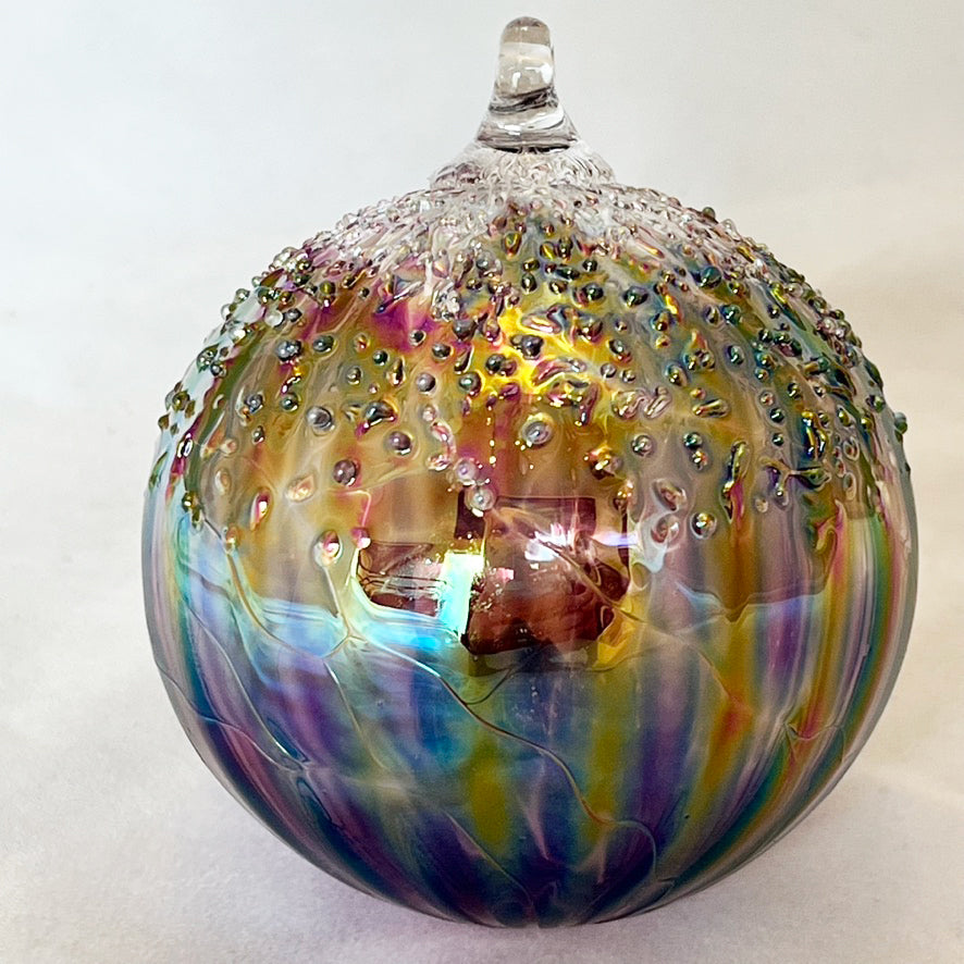 Hand blown glass ornament features iridescent deep multi-colors with glass sugar sparkles. Ornament measures 3 inches in diameter. (TS1)