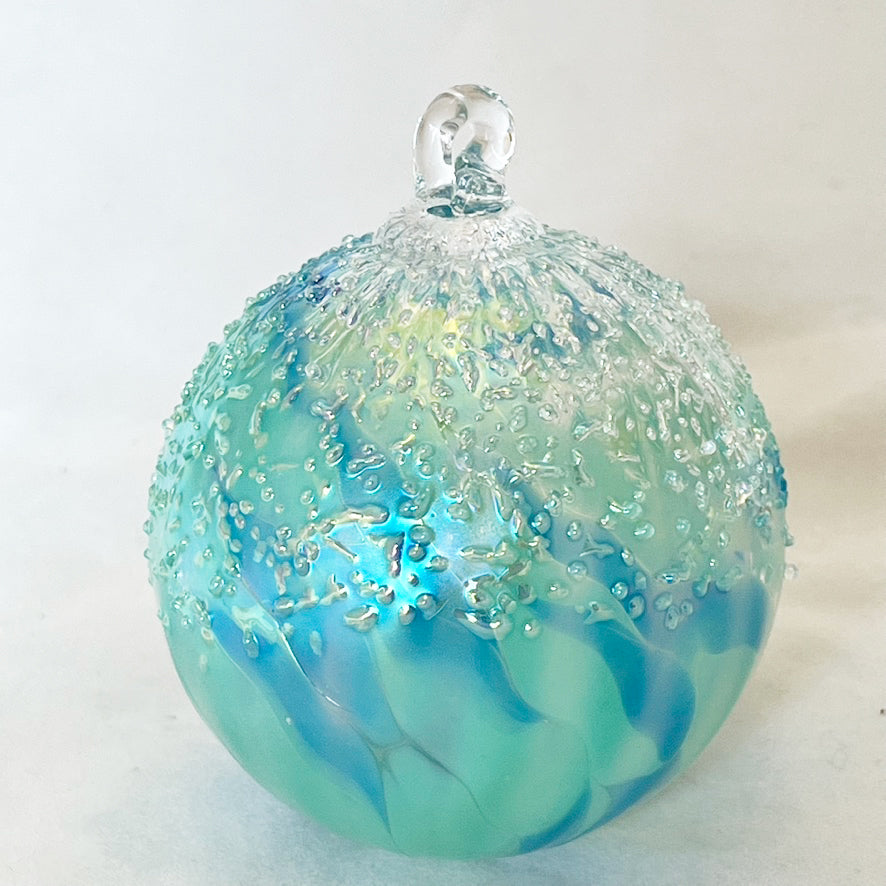 Hand blown glass ornament features iridescent greens and blues with glass sugar sparkles. Ornament measures 3 inches in diameter. (TS1)